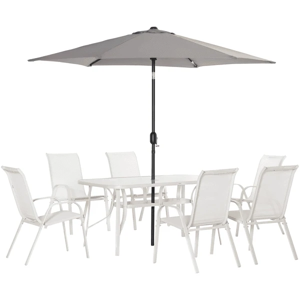Dieses 8-teilige Terrassenset ‘s Parasols lässt sich mit einem leicht zu drehenden Griff an der Stange schnell neigen, um Ihnen auch an heißen Sonnentagen ein kühles Plätzchen im Schatten zu bieten. Diese mit atmungsaktivem Netzstoff überzogenen Stühle sind sehr bequem, um sich zurückzulehnen und Getränke und Mahlzeiten zu genießen, während Sie sich auf der Terrasse oder im Garten entspannen.