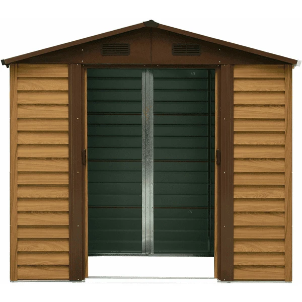 Sie haben noch kein Gerätehaus für Ihre Gartenutensilien? Bei uns finden Sie die Lösung. In unserem Stahlgerätehaus verstauen Sie Ihre Gartengeräte sicher vor Wind und Wetter. Der wertige Schuppen aus robusten Stahlplatten und haltbarem Polypropylen kommt in einem eleganten Holzmaserungsimitat und dunklen Brauntönen. Er kombiniert das Erscheinungsbild eines klassischen Holzschuppens mit den Vorzügen moderner Stahlgerätehäuser. Der Zugang erfolgt einfach über die zwei Schiebetüren. Für Licht und ausreichend Belüftung sorgen die insgesamt 4 Öffnungen an Vorder- und Rückseite. Viel Platz, klasse verarbeitet und optisch ansprechend. Mit Ihrem Metall Gerätehaus bleiben Sie immer bestens sortiert.