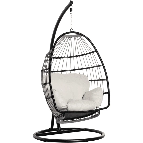 Lassen Sie sich in diesen Schaukelsessel fallen und erholsam die Füße baumeln. Die geschwungene Rückenlehne, die geräumige Sitzfläche und das weiche, einteilige Kissen bieten ein bequemes Sitzerlebnis. Die Hängeschaukel ist aus Metall gefertigt und kann bis zu 160 kg tragen, sodass Sie ganz sorgenfrei schaukeln und sich darin entspannen können. Der Sitzkorb lässt sich zusammenklappen und platzsparend und verstauen. Bereichern Sie Ihren Garten um eine raffinierte, neue Sitzgelegenheit!