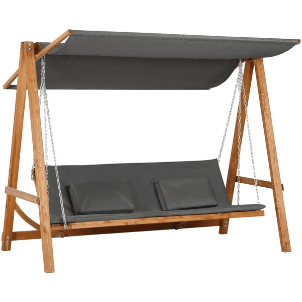 Genießen Sie warme Sommertage in vollen Zügen dank dieser großen Gartenschaukel ! Sie bietet genug Platz für drei Personen und lässt sich leicht in ein Bett verwandeln. Hergestellt aus starkem und zuverlässigem Massivholz und mit einer witterungsfesten Metallkette als Aufhängung ausgestattet, werden Sie wie auf Wolken schweben. Unter der schützenden Dachabdeckung finden Sie immer eine kühle Brise, sodass Sie die Tage erholsam ausklingen lassen können.